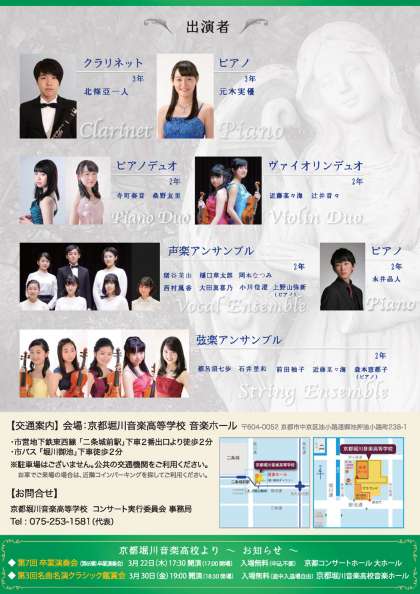 ”音楽の街クラシックホールの夕べ”と題した今年度最後の企画として、本校現役生徒達の心に響く生演奏をお愉しみいただきます。今回は卒業を間近に控えた3年生2人のピアノ独奏、クラリネット独奏、2年生によるデュオ、アンサンブル等多彩な演奏をお届けします。 2月23日(金)本校ホールにて午後6時開演、入場無料です。 お誘いあわせの上ぜひご来聴ください。 校長
