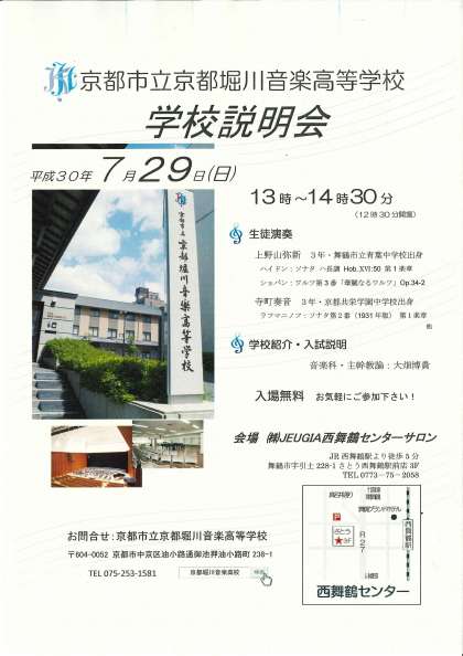 2名の舞鶴出身生徒によるショパンやラフマニノフ等のピアノ演奏をお楽しみいただいた後、動画や資料を使って学校紹介、入試の説明を行う予定です。