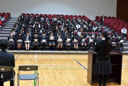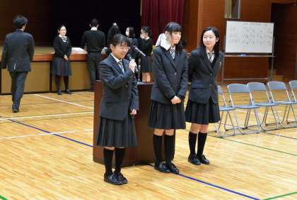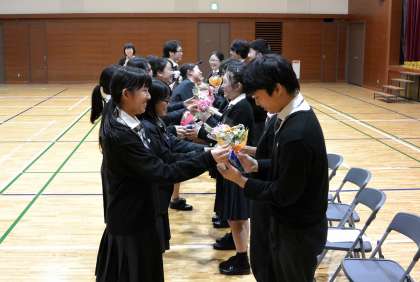 続いて、新しい自治会執行部を選ぶ選挙が行われ、2年生から会長、副会長、会計監査の3人が信任投票で信任され、選ばれました。新役員の決意表明、旧役員の退任挨拶で総会が終わろうとしたとき、突然「ちょっと待ったあ!」の声が観客席から起こり、数名の生徒がフロアーに"乱入"してきました。実は、旧役員にねぎらいの言葉と花束を贈るサプライズでした。会場は驚きと感動に包まれ、全生徒笑顔の中、総会は終了しました。