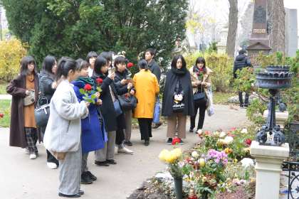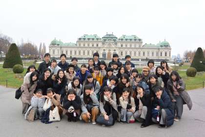クリムトの有名な「接吻」などを鑑賞して,最後の研修地「中央墓地」へ。ベートーヴェンやシューベルトなどの墓をお参りして,モーツァルトの記念碑の前でアヴェ・ヴェルム・コルプスを合唱しました。自分たちを楽しませ,かつ苦しませている作曲者に思いをはせ,生徒たちはさらなる成長を心に誓っているようでした。