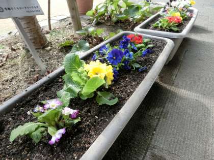 今回植えた植物の花言葉、ビオラ「誠実」、チューリップ「思いやり」、プリムラジュリアン「青春の喜びと悲しみ」です。
