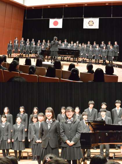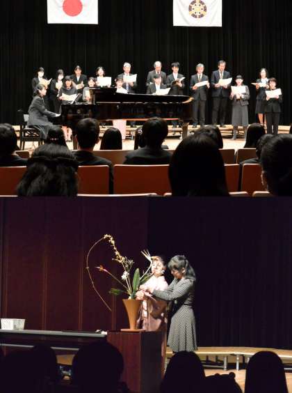 1,2年の合唱の後、3年生が感謝の気持ちを込めて2曲の合唱を演奏しました。最後に教職員の合唱が行われた後、藏野先生の名曲(?)「堀音ブルース」が登場、さらに担任、副担任による“生け花と歌のコラボ”がサプライズ上演され、卒業生は感動と感謝の気持ちでいっぱいになりました。