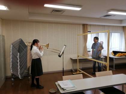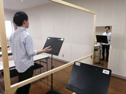 3年生は,専攻実技のレッスンを対面で始めていきます。感染拡大防止のため,マスクの着用や,本校独自で作製したレッスン用「パネル」を使用しての練習となります。パネルは主に,声楽や管楽器の練習に使用します。そのほか,フェイスガードを自作された先生もおられるなど,それぞれの音楽の特性や楽器に合わせた感染防止策をとりながら,レッスンを進めていきたいと考えています。