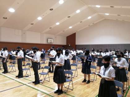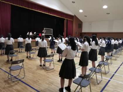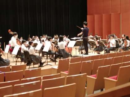 ということもあり,本校では,いよいよ「オケ定」に向けての授業での練習を本格的に始めました。といっても,夏休みに入ってしまいますので,8月18日からの授業再開後に本格的に取り組むことになります。写真はホールでのオーケストラの練習と,アリーナでの合唱の練習です。お互いの距離をとり,マスクを付けての練習を行っています。