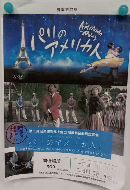 7/12と7/19の2回、ミュージカル映画「巴里のアメリカ人」の鑑賞会を催しました。オーケストラの所属に関係なく、6人の生徒が集まり、アットホームな雰囲気の中で互いに映画内の表現を考察しました。