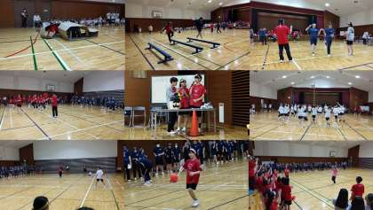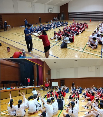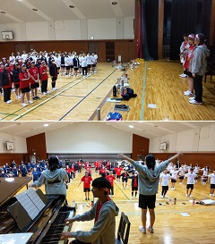 開会宣言【写真1枚目上】のあと、堀音恒例のピアノの生演奏による「ラジオ体操第一」【1枚目下】で体をほぐしたあと、学年ごとにアリーナを2周ランニングして、準備万端、競技に入りました。