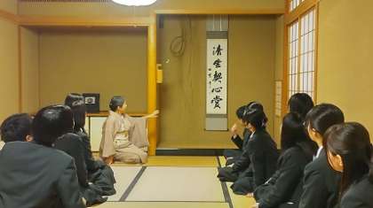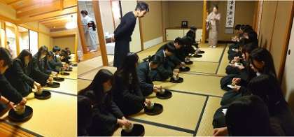 はじめに、お茶席での客と亭主のふるまいについて、先生の解説つきのお点前のデモンストレーションに代表生徒1名が「正客」役となって参加し、その様子を全員で見学しました。【写真2枚目】