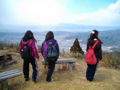 写真:音羽山頂上から京都市街を眺める生徒たち