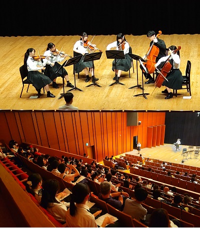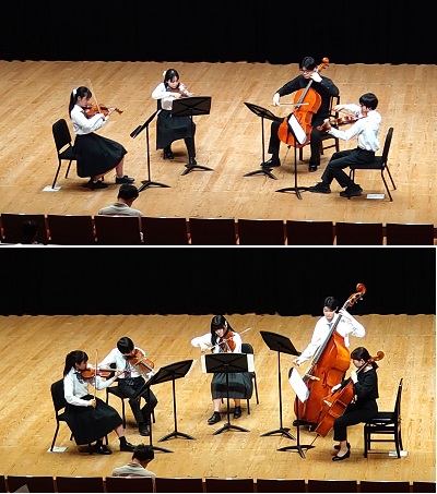プログラムの前半はベートーヴェンの弦楽四重奏曲、ドヴォルザークの弦楽五重奏曲、ブラームスの弦楽六重奏曲、休憩を挟んで後半はブルッフの弦楽八重奏曲と続きました。それぞれの作曲家がそれぞれの作曲家らしく、ヴァイオリン、ビオラ、チェロ、コントラバス4つの弦楽器の特長と、それぞれのアンサンブルの形態の個性を十二分に表現した曲ばかり。アンサンブルの演奏には教員の指揮がつくことはありません。生徒たちが時には教員の意見を仰ぎながらも、作曲家のメッセージを自分たちで解釈しながら、意見を出し合って自分たちの演奏を追究してきたことが伝わってくるステージでした。