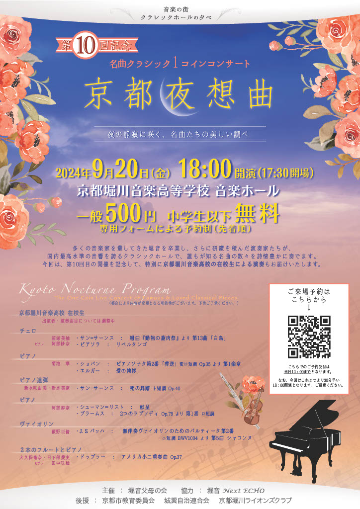 来る9月20日(金)18:00より、本校ホールにて、堀音父母の会主催「第10回記念 名曲クラシック1コインコンサート 京都夜想曲」が開催されます。