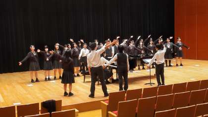 それが終わると今度は、現地でのコンサートで披露する合唱の練習のために、ホールへ移動。振り付けの確認も含め、練習できるのは、残すところ、本日と月曜日の2回のみ。わくわくする思いに緊張も混じりつつ、時間を惜しんで取り組む77期生たちでした。