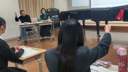 今回は2年生のソプラノ2名が受講し、声楽専攻の生徒たちが聴講しました。一人ずつ、北村先生の伴奏でまず歌唱したあと、歌詞を声に出して読み、ジュリオ先生が手や顔の表情をつけながら、正しい発音やフレーズのニュアンスを伝えてくださいます。それをしっかりと見て聴いて、自分の発音を改善していきます。そして、メロディに乗せて歌い、松田先生から、発声や音程、フレーズの表現などのアドバイスが。その途中途中で、松田先生からジュリオ先生に質問がとび、単に辞書を引くだけではわからない言葉のニュアンスや言葉の持つ語気などについてご説明いただき、繊細で深いレベルで言葉の知識を得ることができました。そのあとにもう一度歌ってみると、言葉が明瞭になり声もよく伸びて、いい歌唱になっていきました。
