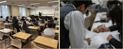 その後、グループに分かれてソルフェージュの授業体験を行いました。初めて体験する中学生にはなかなか難しかったかもしれませんが、在校生がサポートに入って教えてもらいながら取り組んでいました。
