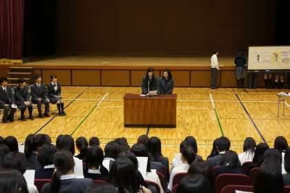 まず、次期生徒会長候補2名、副会長候補1名、会計監査1名および各推薦責任者による演説、投票および開票を経て、新しい役員(2年生)が選出されました。