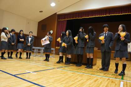 次に、昨年度生徒自治会費決算報告が満場の拍手で承認され、最後に旧役員生徒7名の挨拶をもって閉会ーというところで、サプライズ。全校生徒から感謝の思いを込めた合唱曲、そして花束と色紙が役員生徒に贈られ、拍手と涙の中終了しました。
