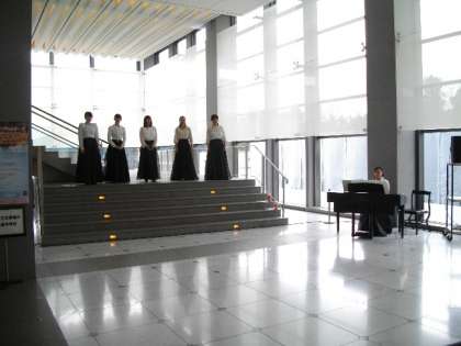当日は朝からあいにくの雨でしたが、ホワイエに並べた椅子では足りないほどのお客様が足を止めて、彼女たちが歌う「ずいずいずっころばし」や「Exultate Deo」を聴いて下さり、生徒たちの晴れやかな笑顔とホワイエに響く素晴らしい声に、惜しみない拍手をたくさんいただくことができました。