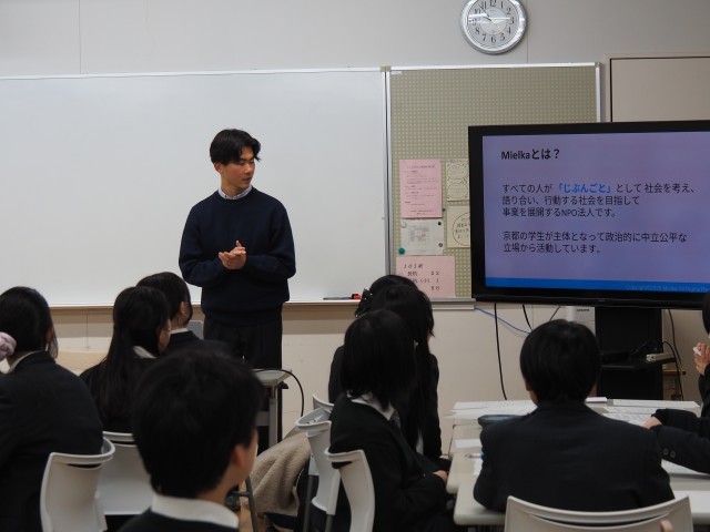 それが終わった直後の2時間目、生徒全員が登校し101教室に集まって特別講座が行われました。今回の特別講座は、京都の学生が主体となって組織されたNPO法人Mielkaさんから大学生の講師の方に来ていただき、授業を行っていただきました。