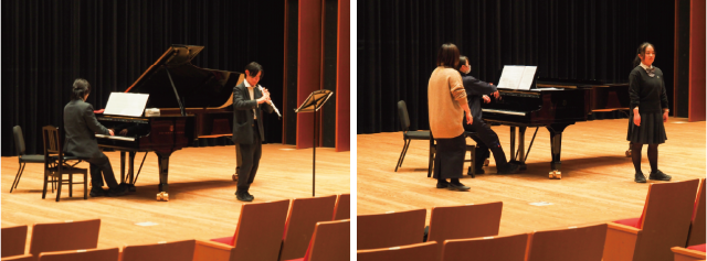それに先立ち、先週からレッスンの時間や昼休み・放課後を利用して、ホールでの練習が行われています。生徒たちは、日頃指導していただいているレッスンの先生の前で、試験本番と同じ場所に立ち、実際の響きや感触を確かめながら演奏しています。