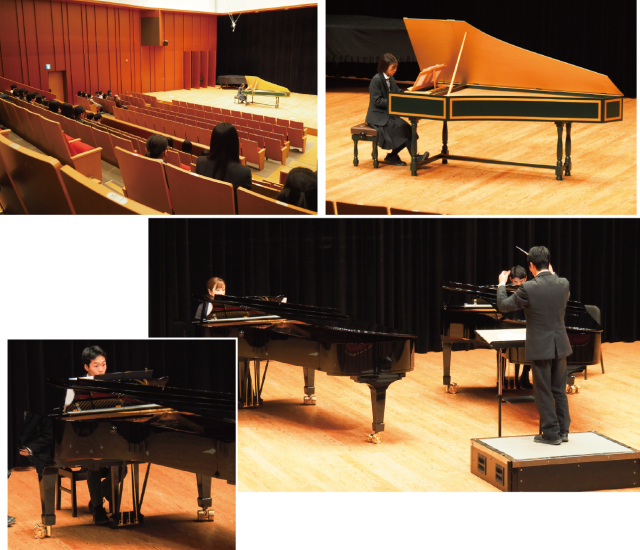 チェンバロ専攻は16年ぶりの専攻で、楽器をレッスン室からホールへ移動するだけでも解体して運んでと、なかなか大変です。また、とても調律が変わりやすく、本番直前までレッスンの先生が調整を行っていました。1・2年生全員に加え、一部の3年生も聴きに来ており、多くの人が見守る中、しっかりと演奏し、普段なかなか生で聴く機会の少ないチェンバロの音色がホールに響いていました。