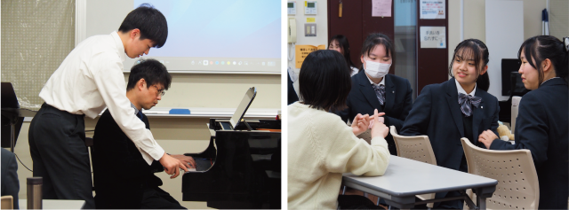 一本の指で行うピアノの即興では、生徒が自由に音を出すのに対して、講師がピアノで寄り添うように音を重ね、その関係の中で音楽が形づくられていきました。そして講師ご自身が「今、自分が音楽療法士の役目をしている」と言葉にされたことで、音で相手の気持ちに関わっていく行為そのものが音楽療法であることに気づく場面となりました。