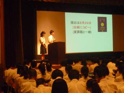 19期生は7月14日(金)海外研修についてアセンブリを行い海外研修委員長に就任した1年4組末吉さんから挨拶と19期生の皆で海外研修を高い意識を持って作り上げていくことを確認しました。海外研修委員より年間予定の確認、夏課題、パスポート取得についてパワーポイントを使って説明がありました。