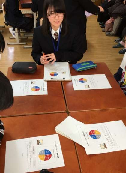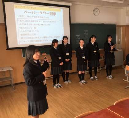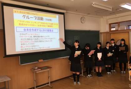 堀川高校の独自科目である「探究基礎」で実際に学ぶ“クリティカル シンキング”を題材として説明や実演を行い,その後,参加した中学生にグループ活動や発表に取り組んでもらいました。視野を広げたり深く考えたりするためには“クリティカル シンキング”が大切であるということを理解してもらおうと,堀川高校生の6名は一生懸命取り組んでいました。授業が始まる前は,緊張し不安そうな表情を浮かべながら直前まで原稿を見直していた生徒たちも,いざ始まれば“スイッチ”が入ったようです。テキパキとした動きとキラキラとした表情をみせた堀川高校生たち!