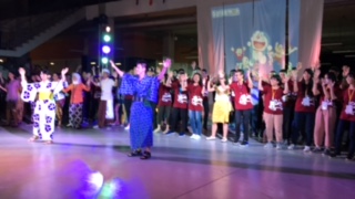 表彰の後、ホールの一階から参加者が出ると、KVISの生徒たちが花道を作ってくれています。その先にフェアウェルパーティー会場があります。そのままパーティーは始まりますが、堀川チームは浴衣に着替え、出しものに備えます。参加各国の出しものが繰り広げられます。堀川チームはドラえもん音頭を披露して、会場の皆さんを一緒に踊りに誘います。皆さん元気に踊ります。
