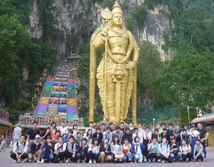 午後は、クアラルンプール周辺の観光をしました。プトラジャヤのピンクモスクの見学では、その造形美に多くの生徒が魅了されていました。バトゥー洞窟前で集合写真を撮った後、約1時間の班別自由行動に入りましたが、突如雷雨に見舞われました。体調不良者等はありませんでしたが、雨に濡れた生徒もいたため、海外研修委員たちが機転を利かせ、その後の行程を変更し、先にホテルへ向かいました。雨も止み、着替えを済ませてから、貸し切りバスで再出発し、夕食会場へ向かいましたが、今度は帰宅ラッシュの渋滞により、行程に遅れが生じました。それでも、夕食後は、ペトロナスツインタワー内の伊勢丹での買い物や、聳え立つビルディングの夜景を楽しみました。予定より帰りが遅くなりましたが、ホテルに戻った時の様子は、皆満足そうでした。