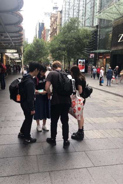 班別研修では、各班目当ての場所へ移動して街の人へのアンケートを実施。昨日のプレゼンの経験も活かして積極的に話しかけると、想定していた以上に親切に応えてもらえて喜んでいました。