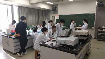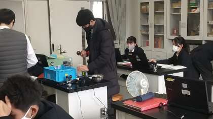 この時期,感染予防の観点から,理科の授業内でのグループ等での実験は控えていますが,探究基礎のゼミは少人数講座で教員等の指導が行届くこと,個々に活動することから,常時換気や器具の消毒,余計な私語の禁止等も徹底して個人探究にむけての実験を行っています。