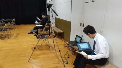 4月23日(土)午前に,23期生保護者会を行いました。今回は,現在の感染拡大状況に鑑み,学校にお越しいただくか,ご家庭などでZoomの配信をお受け取りいただくか,を選択いただける,ハイブリッドな形で実施しました。学校にお越しいただいた保護者の方には,お子様のHRにおはりいただき,お子様のお席にごちゃくせきいただき,講堂からの配信をご視聴いただくということにしました。