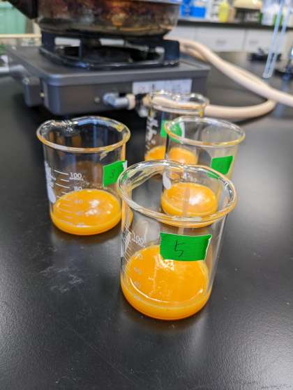 上:卵に量を変えたメチルセルロースを混合したビーカー