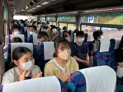 写真中:バスの中でコース長から「無事屋久島につきました」とあいさつがあったときの様子
