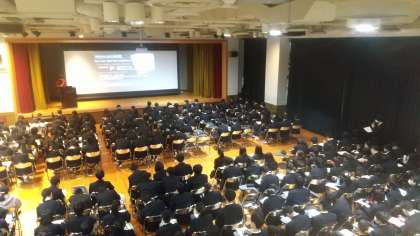 12月22日(水)、昨日から始まった、冬の全員学習学年企画として、24期生(1年生)が、本校卒業生(自然探究科 6期生)の田中亮平さんの講演会を行いました。田中さんは京都大学工学部で材料工学を専攻され、博士課程修了・博士号取得ののち、助教として大学にお残りになりました。その後、ロケット開発を行う民間ベンチャー企業インターステラテクノロジーズ(株)に転職され、現在は北海道大樹町で、軌道投入ロケット「ZERO」のエンジンコンポートネントの設計や生産技術開発や産学官における材料系共同研究を担当されています。