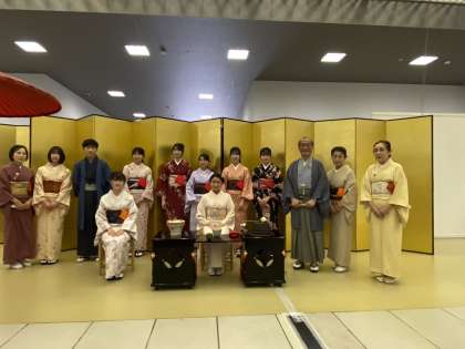 ひとりひとり着物を着つけていただいたので、お点前についてもお運びについても、ひとつひとつの所作の意味がよくわかるようになる経験となりました。お茶碗も、棗も、水指も、すべて会場の作家物で、短冊は「心静百事好」という坐忘斎お家元のものでした。普段のお稽古では触れられない素晴らしいお道具に囲まれ、塔南高校の皆さんとも協力しあって、200席以上のおもてなしを経験させていただけました。茶道部長は「文化祭にむけて自信がついた。とても疲れたけれど本当にいい体験だった。ぜひ後輩たちにも体験してもらいたい」と興奮気味に語ってくれました。