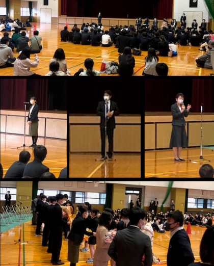 その後、生徒代表たちから転退任される先生方に花束の贈呈を行い、その後先生方は、参加した全員が拍手を送る花道を退場されました。