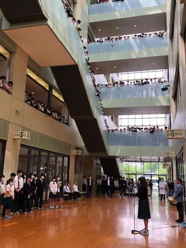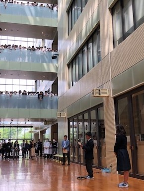 会場はアトリウムでしたが、生徒たちは、廊下や渡り廊下に鈴なりになり,アトリウムをのぞき込む形で、全校生徒が参加しました。