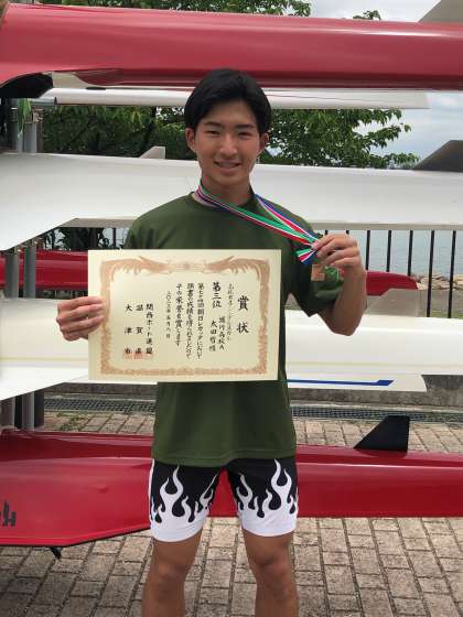 5/3〜5/6にボートの「第74回朝日レガッタ」が、滋賀県の関西みらいローイングセンターで行われ、3年生の太田哲惺さんが高校男子シングルスカルで3位入賞という快挙を成し遂げました。