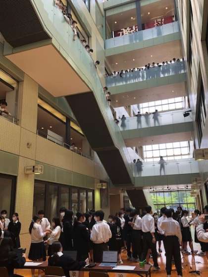 アトリウムには各クラスのクラス活動部員の他、多くの生徒が集まり、仲間とともに楽しそうな時間を共有していました。