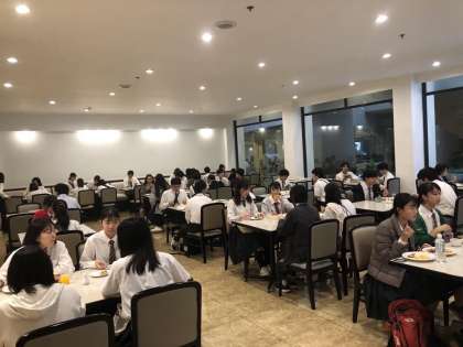 本日は、現地の学校訪問およびサイアムスクエアでの自由散策を予定しています。写真は、朝食時の生徒の様子です。