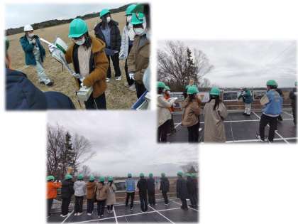 午前中は、大熊町・双葉町にある中間貯蔵工事情報センターを訪れ、中間貯蔵施設を見学しました。この場所は、福島県内の除染に伴い発生した除去土壌や廃棄物、焼却灰等を貯蔵するための施設です。生徒たちは、大熊町にある受入・分別施設や土壌貯蔵施設を回りながら、放射線量の測定体験を行ったり、説明を聞いたりしました。広大な施設や、震災発生後そのままの建物。映像に「 収められた」ものでは分からない広さ、静けさを感じました。