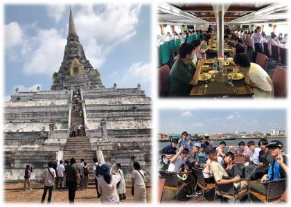 午前中のアユタヤ遺跡群見学で、ワットマハタート、ワットプーカオトーンを見学しました。連日の猛暑にも関わらず、全員が遺跡群の中を愉しく散策し、古の王朝から悠久の歴史に想いを馳せていました。