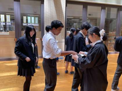 5月9日(木)昼休み、アトリウムにて、文化祭での各クラスの企画(出し物)の発表の順番を、生徒会執行部の主催で抽選しました。これにより、当日の各クラスの生徒たちの出番が決まりました。本校の文化祭では、例年、1,2年生の各クラスは講堂で劇などのパフォーマンスを、3年生の各クラスは、アトリウムでダンスなどのパフォーマンスを実施します。