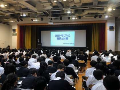 今年も中京署の交通安全課の方から、具体的な交通規則やその危険性をお伝えいただきました。また、今年は生活安全課の方にもお越しいただき、「SNSトラブルの現状と対策」についてのお話をしていただきました。