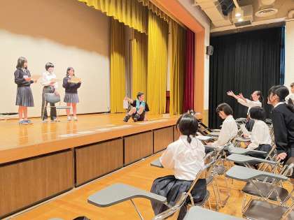 はじめに、舞台上でのコミュニケーションに関する簡単な身体ワークショップを行いました。ワークショップを通して、「どうやるかではなく、相手がどう思っているか」など、コミュニケーションを表現するうえで大切なことや、表現の強弱や演技の間、ポジション・距離など、観客に表現したい状況を伝えるための技術・工夫を体験しながら、学びました。そのあと、劇団うりんこさんの新作『ある晴れた夏の朝』の実際の台本をもとに、一場面の台詞読みを実演しました。生徒たちは、3つのグループに分かれ、それぞれがワークショップで得た技術・工夫をもとに即興で演じたあと、お互いの工夫していた点を交流しました。