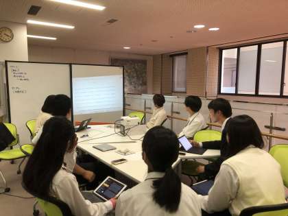 出発まで約1週間前となった17日(金)の放課後、図書館2階のラーニングコモンズに生徒たちが集まり、会議冒頭に課題に対して自国の立場やテーマについての考えを述べる1分半程度のスピーチ(もちろん英語)の練習をしていました。