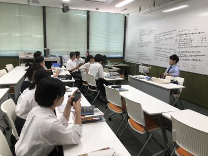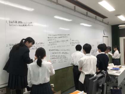 教室前面に広く設置されたホワイトボードに、ペアを組んだ生徒たちが考査範囲の学習内容と授業者(教員)の意図を踏まえ、生徒目線で作成した問題が次々に書き表されていきます。生徒たちは、自分たちの問題を仲間がどのように答えるかが楽しみな様子。日本史の学習が好きな生徒が多いことが伺えます。一通り書き終わったら、生徒たちに小型のフリップが配布され、クイズ大会のようにそれぞれの設問に挑戦。解答解説はもちろん出題した生徒たち。先生になり、生徒になりと立場を変えながら、学習内容の理解を深めていました。
