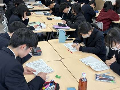 学年末考査終了の翌日、3月4日(火)。1年生(26期生)は、いよいよ出発があと数日に迫った宿泊研修に向けての、コース別会に取り組みました。