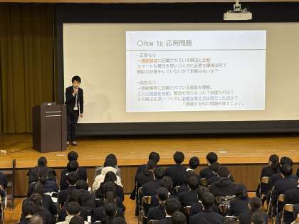 午前中に基礎力等を確認するテストを受験した後、講堂に集合。冒頭、進路指導主事の先生より、2年生でより本格的になる「探究基礎」JUMPの課題設定について、ただ自分が好きだ、というだけでなく、自身のキャリアと緩やかにつながっていくようなものであるとよいというアドバイスや、宿泊研修をより良い時間にという励ましの言葉などがありました。