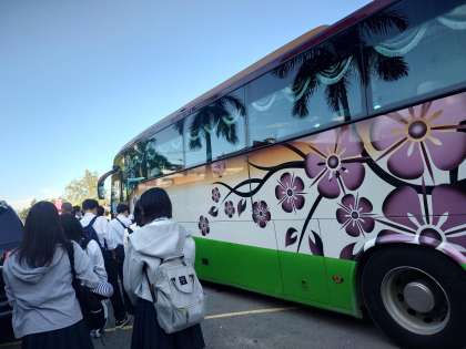 昨日1日をかけての移動で疲れが出た生徒もいますが、多くの生徒は元気に活動開始です。ホテルを出発し、現地の高校マクタブサバとの交流に向かいます。